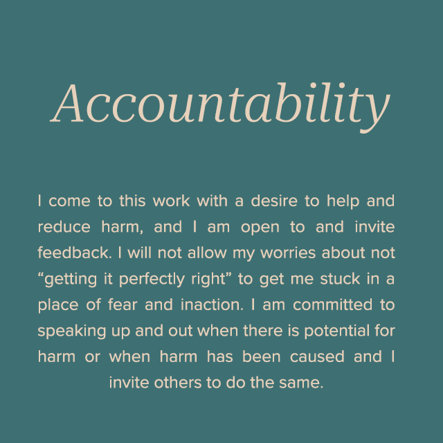 I come to this work humbly, passionately, with accountability practices in place, and with a commitment to ongoing learning, relationship building, and community care.